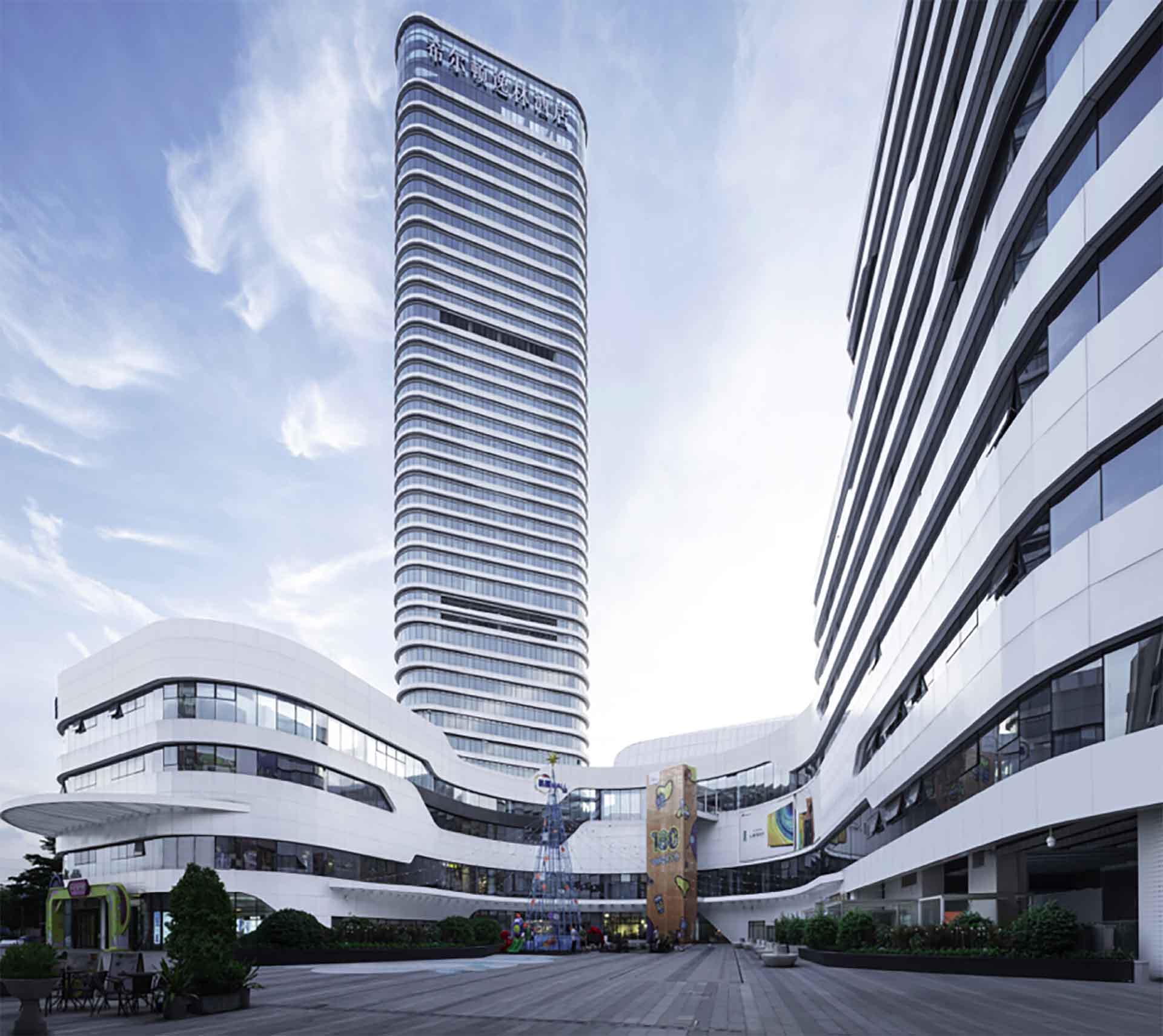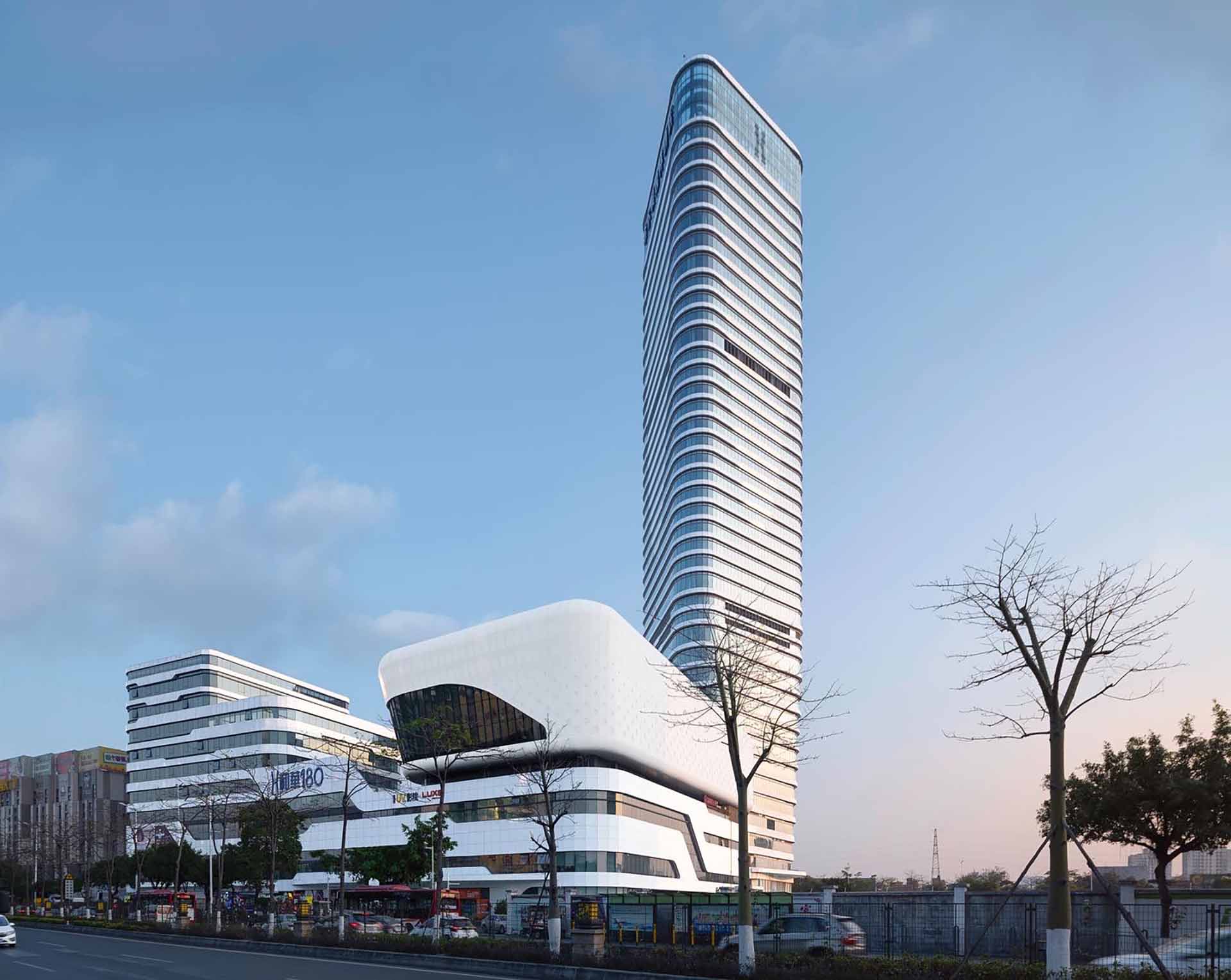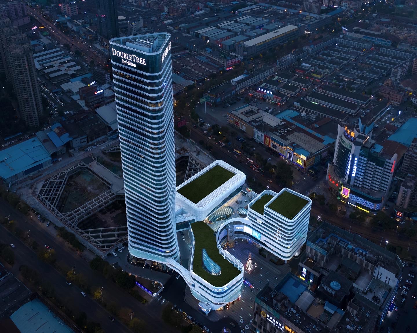 The HHICC Plaza and Hilton Hotel stand as benchmark models of urban regeneration and renewal. The award-winning architecture, designed by ADARC Int’L Studio, comprises a commercial complex that seamlessly integrates a star-rated hotel, offices, retail, banquet facilities, and exhibition spaces. The international Hilton Hotel brand occupies the highest part of the super high-rise tower. The hotel lobby is situated at an impressive altitude of 170 meters, offering a panoramic view of the two prosperous capital cities of Guangzhou and Foshan. The architectural layout is primarily composed of several major functional elements: commerce, office, hotel, banquet, and exhibition. These distinct yet interconnected areas are meticulously interspersed, enclosed, and superimposed, forming a highly diversified and integrated commercial and urban design model. The project’s facade adopts a simple and elegant streamlined design approach. The super high-rise tower utilizes a smooth, curved surface rotation shape, while the commercial podium employs a stepped stacking process. This design strategy creates a natural, smooth, and ecologically-minded urban scene.