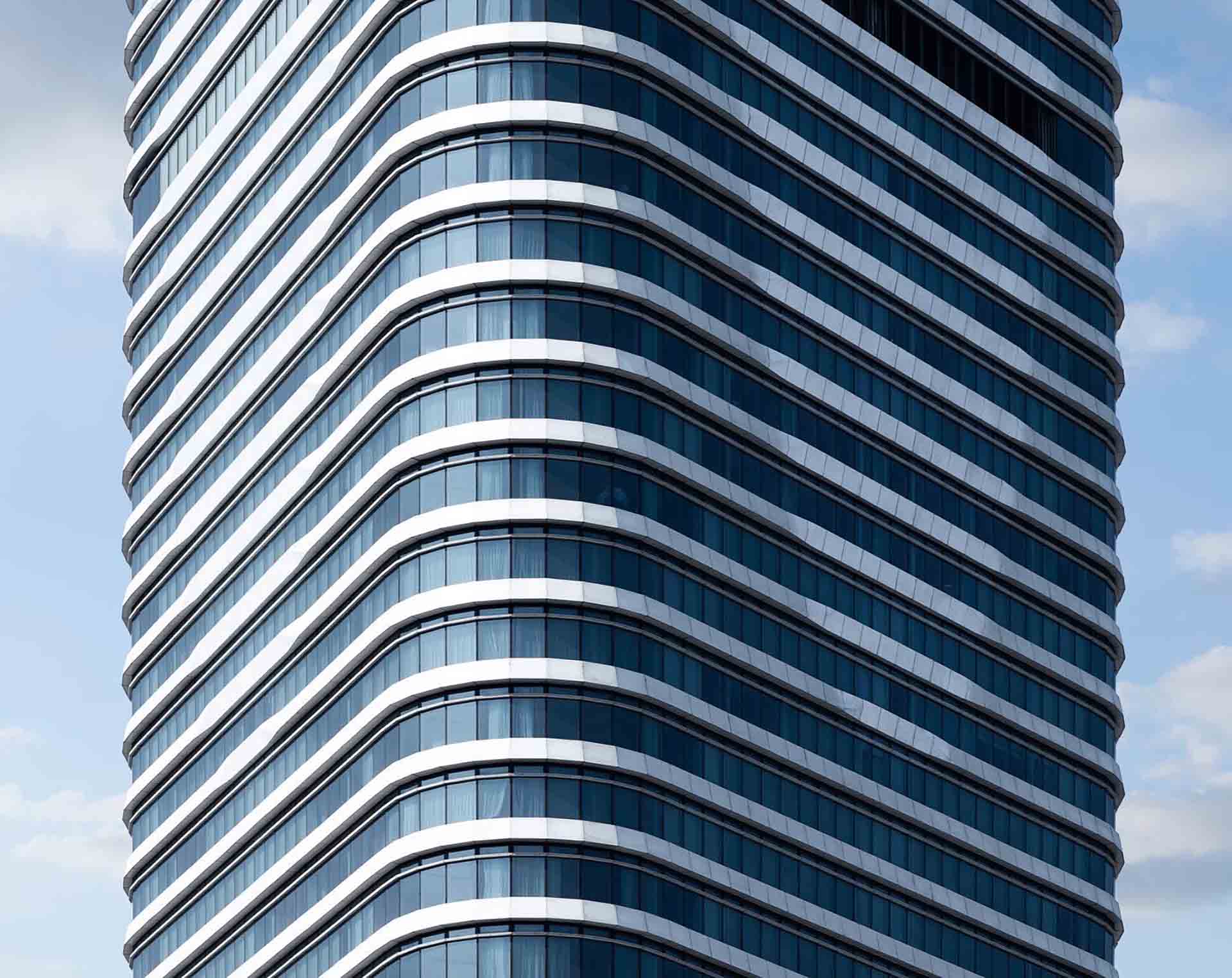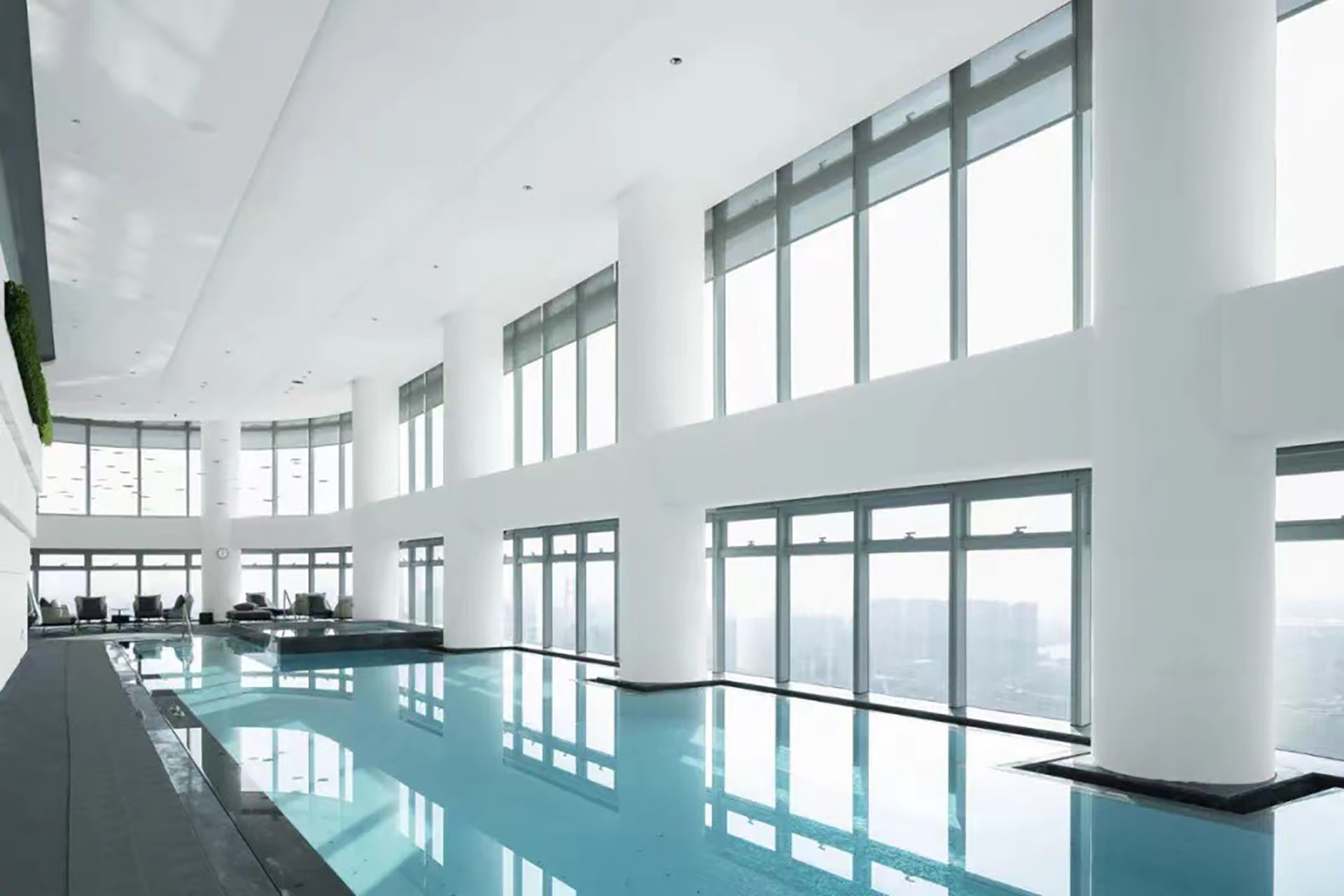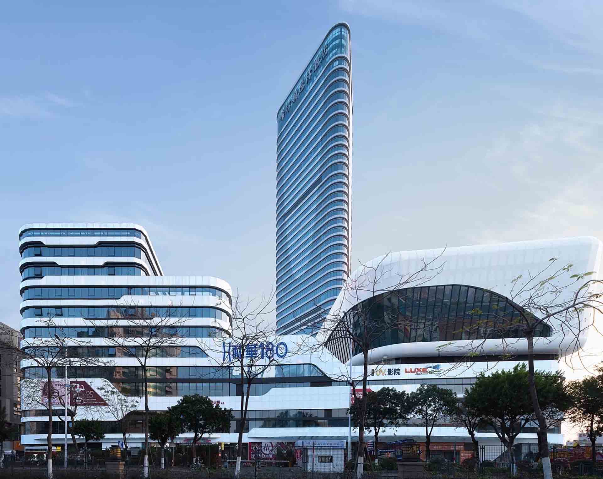 The HHICC Plaza and Hilton Hotel stand as benchmark models of urban regeneration and renewal. The award-winning architecture, designed by ADARC Int’L Studio, comprises a commercial complex that seamlessly integrates a star-rated hotel, offices, retail, banquet facilities, and exhibition spaces. The international Hilton Hotel brand occupies the highest part of the super high-rise tower. The hotel lobby is situated at an impressive altitude of 170 meters, offering a panoramic view of the two prosperous capital cities of Guangzhou and Foshan. The architectural layout is primarily composed of several major functional elements: commerce, office, hotel, banquet, and exhibition. These distinct yet interconnected areas are meticulously interspersed, enclosed, and superimposed, forming a highly diversified and integrated commercial and urban design model. The project’s facade adopts a simple and elegant streamlined design approach. The super high-rise tower utilizes a smooth, curved surface rotation shape, while the commercial podium employs a stepped stacking process. This design strategy creates a natural, smooth, and ecologically-minded urban scene.