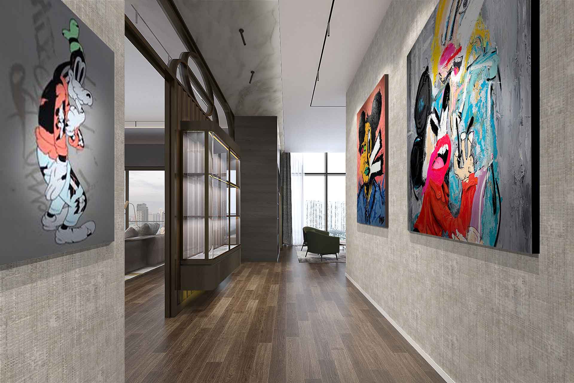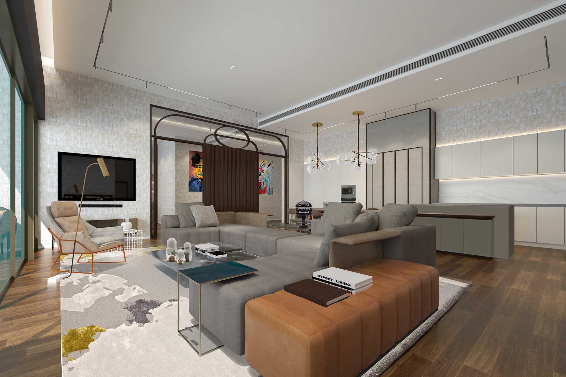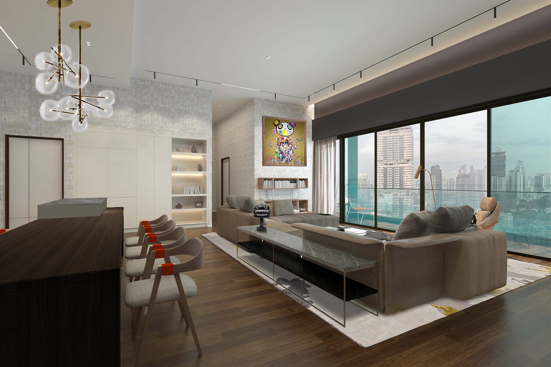 This roof top private residence at Sukhumvit Bangkok features two substantial studio galleries, each flowing into another, that highlight the owners’ art collections, and serve as a party venue, meeting place, or even a reading nook. Mobility and variability of all components became an important aspect of the overall design.
